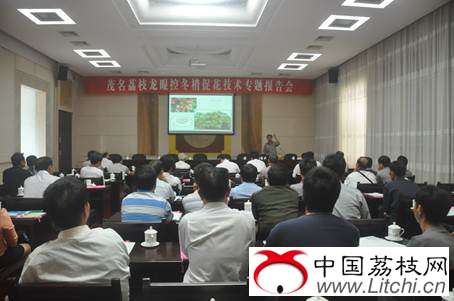 茂名是我国荔枝主产之一,在各方的共同努力、今年荔枝收成好。采后及时管理、秋梢生长快。但末次秋梢结果母枝转绿老熟偏早,到10月上中旬部分荔枝末次秋梢已经老熟。11月上旬天气又持续高温干燥,一旦降水荔枝会大量萌发冬梢,控梢难度和强度会很大。为切实做好荔枝龙眼的冬季管理、控好冬梢为明年增产打好坚实的基础。在11月11日,茂名综合试验站约请体系岗位团队成员王泽槐教授在茂名迎宾馆举办了“茂名荔枝龙眼控冬梢促花管理培训班”。出席培训班有各示范骨干、示范果园场长、果农代表等技术人员100多人。会上王教授详细地介绍了荔枝、龙眼控梢促花的时机和办法。王教授的演讲、内容丰富、图文并茂,深入浅出、结合茂名生产实际、生动的讲授得到学员的一致好评。