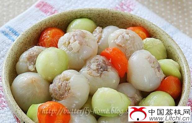 6)一次把所有的肉馅都放入荔枝肉内
