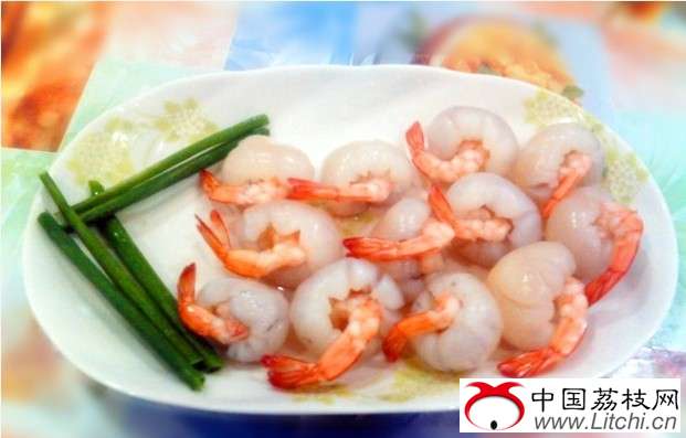 荔枝去核,放淡盐水中浸泡,虾去头留尾去泥肠,用盐、鸡精、料酒腌制10分钟