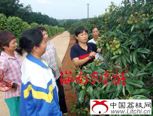 图为东昌农场机关党总支书记王玉淑(右二)深入六队果园,向农户介绍荔枝管理技术