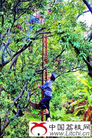 持续雨水的原因,一经放晴,村民们就带着长梯赶忙到果园摘荔枝。