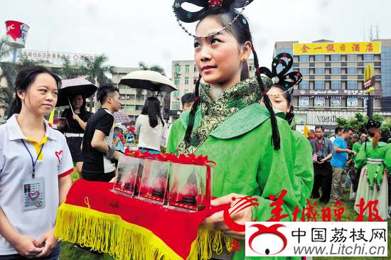 荔枝红了!增城一年一度的荔枝文化旅游节昨日开幕,12颗挂绿荔枝分别赠送给增城2013年“十佳好人”。据悉,增城挂绿荔枝曾拍出一颗55.5万元高价,并入选世界吉尼斯纪录。昨日,广州市委常委、增城市委书记欧阳卫民操刀完成“第一剪”,将挂绿果赠予市民。
