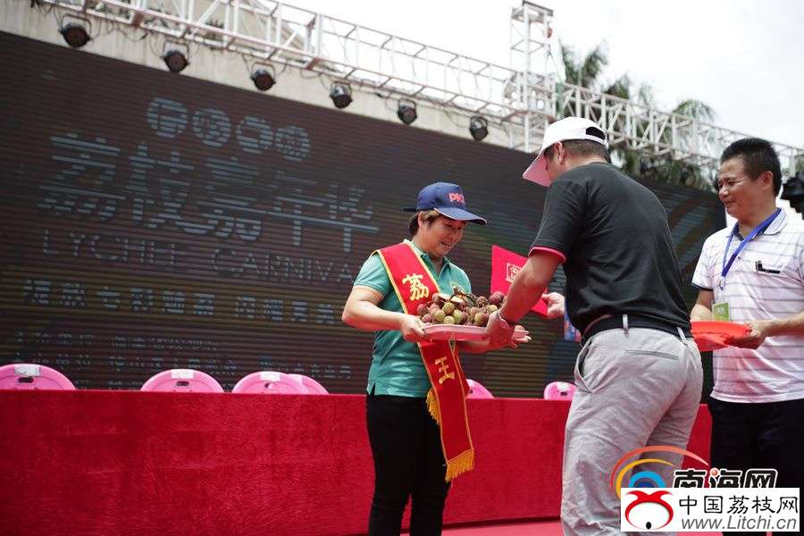 南海网、南海网客户端海口5月20日消息(南海网记者 周静泊)在5月20日开幕的海口市第七届荔枝交易会暨第一届七彩气球荔枝嘉年华的“荔枝王”比拼活动上,海口市琼山区三门坡镇新德村委会农户鲁巧丽家栽种的妃子笑以91.3的高分赢得了“荔枝王”称号,抱走了2000元奖金。在随后的拍卖环节中,新鲜出炉的“荔枝王”卖出了21800元的高价。